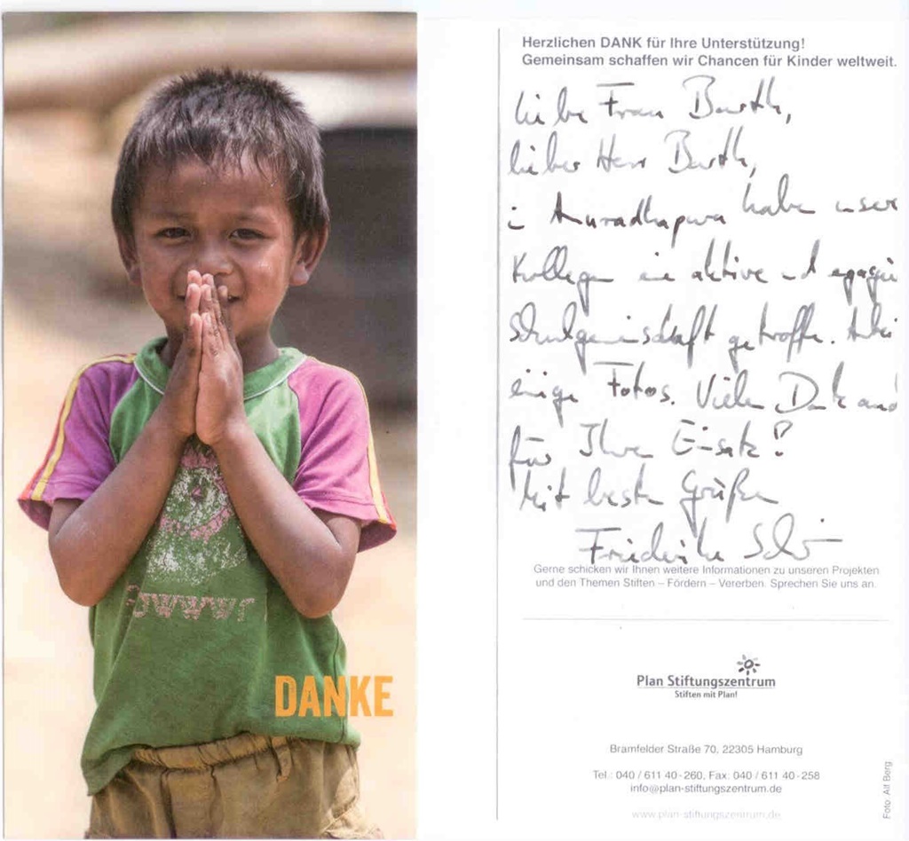 Seit Anfang 2014 unterstützen wir über Plan International Deutschland e.V. unser Patenkind Nethsara. Bei einem persönlichen Besuch im März 2015 wurde die Familie einerseits mit einem Geldbetrag und andererseits mit einem neuen Fahrrad sowie Schulutensilien für die Kinder unterstützt.